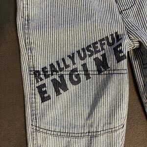 Adorable vintage-inspired Thomas the Tank Engine overalls! These 2T blue striped overalls are perfect for your little conductor.