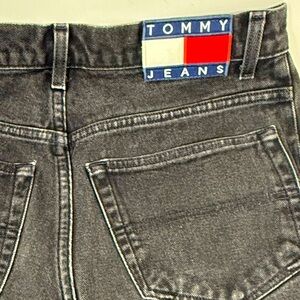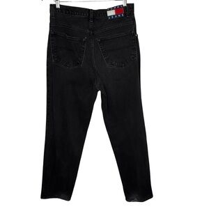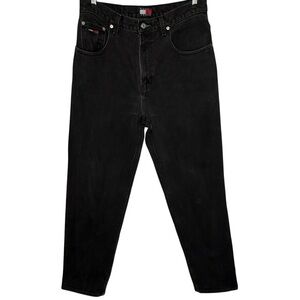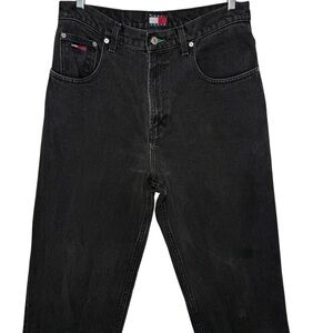 Y2K Tommy Hilfiger Men's High Rise Black Denim Jeans Cotton Size 32 X 32 Large Flag Logo Patch Spellout