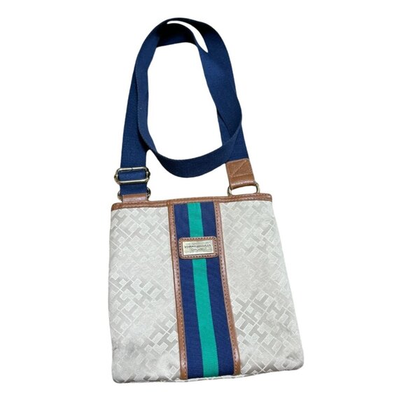 Y2K Tommy Hilfiger Crossbody Purse Handbag Bag Tan Blue Strap 8"X 7.5"
