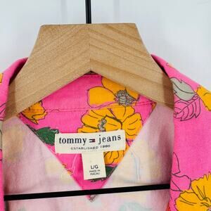 Vintage Y2K Tommy Hilfiger Jeans floral blazer in women’s size Large. Bold pink base with allover yellow/orange floral print, notch lapel collar, front tie closure, and long sleeves. A true retro statement piece—perfect for fans of early 2000s fashion, festival looks, or collectors of vintage Tommy Hilfiger.