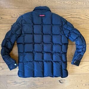 Classic Tommy Hilfiger Jeans navy puffer jacket, men’s size Small. This vintage-inspired quilted down coat features snap button front closure, dual chest flap pockets, side pockets, collared design, and the iconic Hilfiger flag logo on the sleeve. Interior features a patriotic flag patch and quilted lining for extra warmth. Lightweight yet insulated with a 60% down / 40% feather fill for comfort and style.