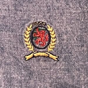 Y2K Tommy Hilfiger Denim Button Down Shirt in Medium Wash Blue Denim lined in Red Satin Quilted Material. It is a great Shacket to layer on warmer days or just wear alone. It is Long Sleeve, has a Full Button Front and has a great great Rustic Outdoor feel