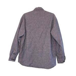 Y2K Tommy Hilfiger Chambray Denim Button Down Shirt in Medium Wash Blue Denim lined in Red Satin Quilted Material. It is a great Shacket to layer on warmer days or just wear alone. It is Long Sleeve, has a Full Button Front and has a great great rustic bohemian feel
