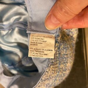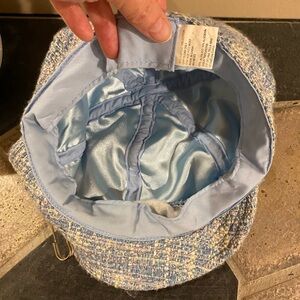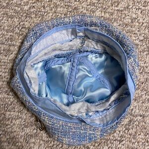 Early 2000s Tweed Blue Bouclé Cadet Cap (Baker Boy Style) With Safety Pin Accent featuring a textured pastel blue and ivory tweed weave with soft brushed fibers for cozy texture. This chic early-2000s piece blends ladylike bouclé styling with a playful edge, finished with a silver safety pin detail for that unmistakable indie sleaze aesthetic. Fully lined in satiny light blue for a smooth, comfortable fit.