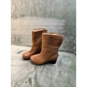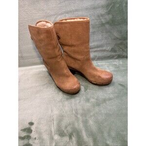 Y2K style UGG Boots is a stylish and comfortable pair of women's boots in a size 7 with a round toe shape. Made with tan suede and lined with shearling, these clog-style boots feature a mid-heel height, making them perfect for casual occasions in fall, winter, or spring. The UGG brand ensures quality, and the leather upper and insole materials provide durability and a luxurious feel. Perfect for adding a touch of warmth and fashion to your outfit, these UGG boots are a must-have for any woman's shoe collection.