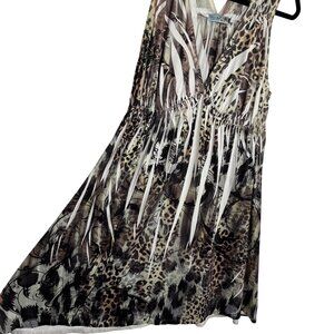 Keywords: animal print dress, empire waist tunic, sleeveless dress, Unity World Wear, women's dress, small tunic dress, polyester dress, leopard print style, black and brown dress, lightweight tunic, casual wear dress, A-line sleeveless, patterned tunic, unity world wear dress, unity world wear mini dress