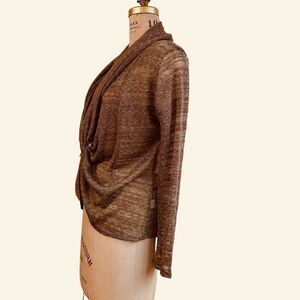 Y2K Unyx Twisted front Brown with sparkly metallic bronze gold thread fine knit long sleeve semi sheer lightweight sweater top including ring to thread front through. Can be used with or without . Can be worn a few different ways to show as much skin as you choose. Twist it around the neck for a cowl effect or twist it around the back