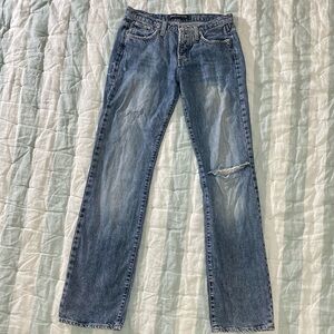 Y2K Authentic Versace Couture Jeans in a button fly. Mid wash with distress details throughout especially behind right back pocket and at knee area as pictured. Leather tab is unstitching a little. Please see all pictures for details and description.