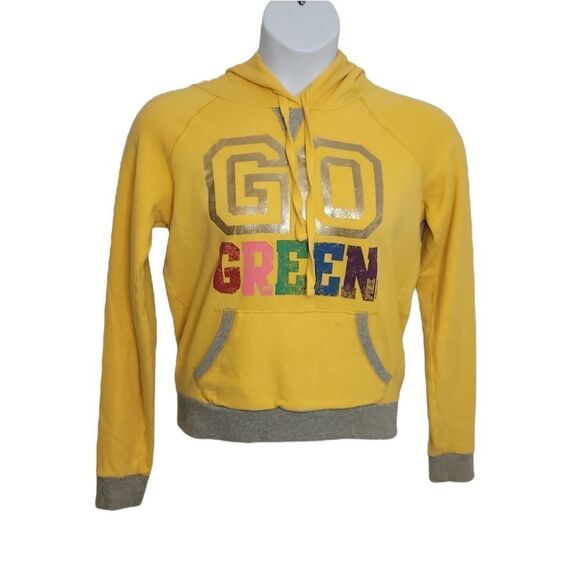 Victoria's Secret Pink Y2K era bright yellow hoodie with go green in distressed rainbow and metallic lettering. Show your love of saving the planet and recycling with this fun sweatshirt. Cotton polyester.