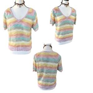4. 90'S VTG. SPRIT CROCHET KNIT PASTEL STRIPE SWEATER TOP LARGE. A LITTLE SEE THROUGH.
