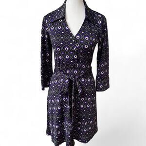 BEAUTIFUL PURPLE/GRAY/BLACK/WHITE RETRO FUNKY PRINT, ADJUSTABLE TIE WAIST, DEEP V NECK AND FRONT BUTTONS. EXCELLENT CONDITION.
