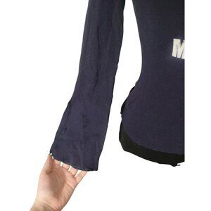The Y2K VTG Charlotte Russe Lace Up Lettuce Hem Mustang Sporty Varsity Bell Sleeve Blouse is a vintage-inspired top featuring a graphic print with a Belle character design. Made from 100% cotton, this navy blue blouse has long bell sleeves and a V-neckline with lace-up closure. The extra-slim fit and classic style make it perfect for various seasons and occasions, adding a touch of hipster, USA, and sports themes to any outfit. Perfect for women who love retro fashion and unique accents like a cute bow detail on this sporty varsity-inspired top.