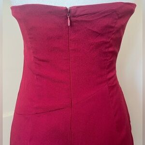 This elegant strapless dress features a rich burgundy color, perfect for any special occasion. The stylish design is gathered fabric that gives a asymmetrical look and enhanced with a decorative embellishment broach women's size small back zip closure