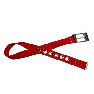 Crafted in a vibrant red cotton canvas, it’s both durable and stylish—ideal for pairing with low-rise jeans, cargo pants, or mini skirts. Adjustable with multiple grommets, this belt fits waist sizes 27–34 inches.