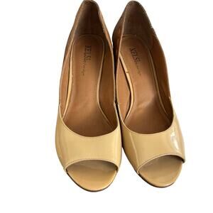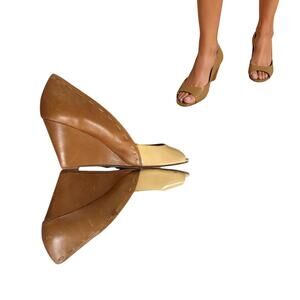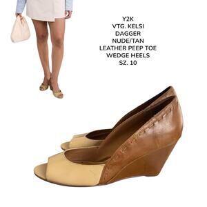 Y2K VTG. KELSI DAGGER NUDE/BROWN LEATHER PEEP TOE WEDGE PUMPS SZ 10.