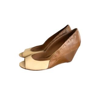 Tan and cream leather wedges with 3" heel, featuring a peep toe design
