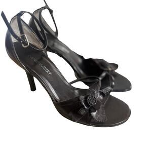 LEATHER UPPER. VERY GOOD CONDITION. Black Nine West high heels with ankle strap and flower detail