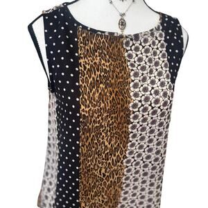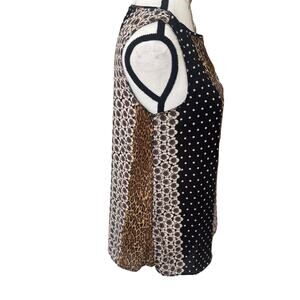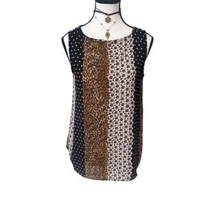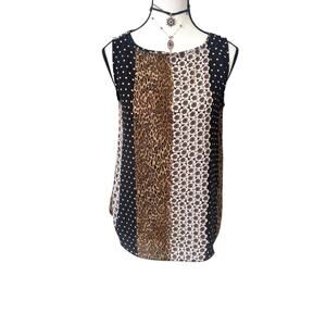 Brown and black leopard print sleeveless top with polka dots and stripes