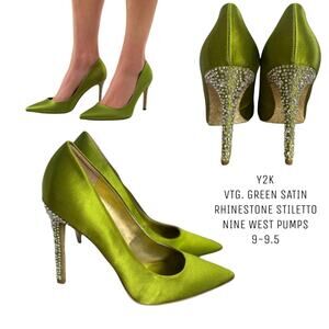 Y2K VTG. STUNNING RHINESTONE GLITTERING GREEN SATIN NINE WEST STILETTO HEELS