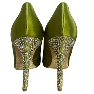 Green satin stiletto heels with rhinestone embellishment