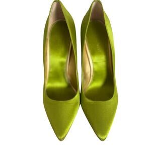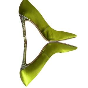 lime green, satin, stiletto, rhinestone details, glamorous, pointed toe, evening wear, elegant, slip-ons