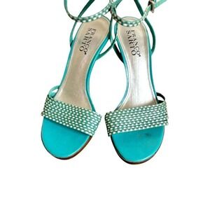 Y2K VTG. TEAL LEATHER BRAIDED WOVEN ANKLE STRAP FRANCO SARTO HEELS SANDALS SZ. 6 1/2