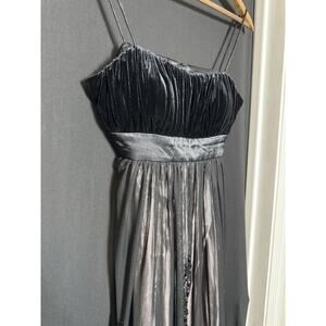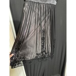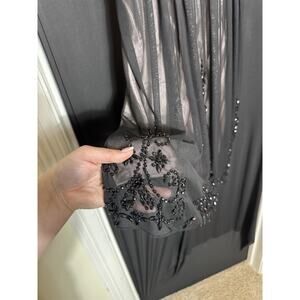 This stunning black dress by S.L. Fashions is perfect for any formal party or cocktail event. The sheer lace and ruffle accents, along with the sequin detailing, create a whimsical fairy-inspired look that is sure to turn heads. The dress features a V-neckline and sleeveless design, making it a great choice for warmer weather events.