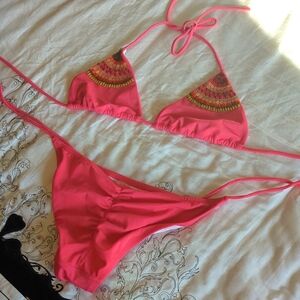 Amazing! nearly vintage Victoria's secret bikini Coral in color with beading on string top string bikini bottoms scrunch butt size small bottom size medium top this is an excellent condition