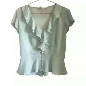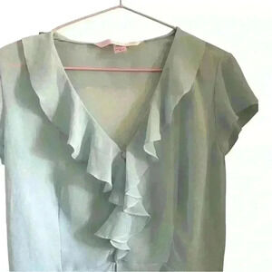 The most gorgeous Victoria’s Secret two piece pajama set. Has a cute short sleeve top with blue buttons. Bottoms have an elastic waist and ruffled detailing at the bottom. Perfect for these hot summer nights. See through.