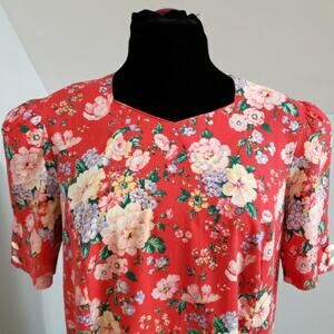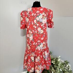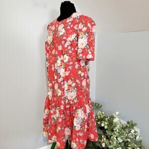 Y2K Vintage 80s Macro Red Floral Short Sleeve Ruffled Lower Midi Dress Size 8