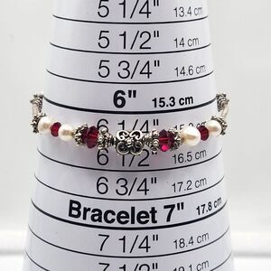 Elegant bracelet handcrafted with genuine pearls, sterling silver and ruby color glass bi-cone beads. Ideal for adding a touch of sophistication to any outfit. This beauty measures 6.25" and in excellent vintage condition. Please feel free to ask questions.