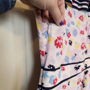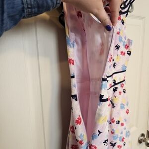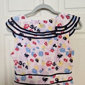 Charming floral dress with ruffle details. Features a colorful pattern with red, blue, and yellow flowers.