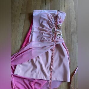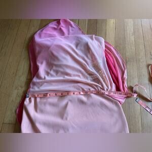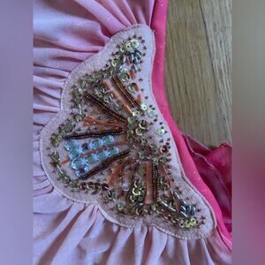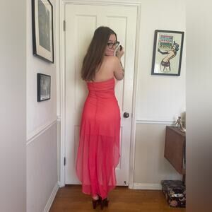 A Y2K classic! This dress reminds me of something Paris Hilton would have worn. It is a strapless pink / peach tube top dress with a sheer overlay that is peach in the front, and hot pink in the back, almost an ombre effect. The overlay is asymmetrical. The side of the dress has a beaded gathered circular flower. In good vintage condition - missing some beads and stones as seen in pics. Marked a size 5, approximately a small.