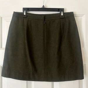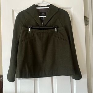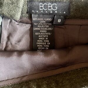 Vintage Y2K BCBGMaxAzria dark green Wool Blend suit with mini skirt and jacket. Skirt is size 8 and jacket is size 6. Both lined. Skirt features a zip and hook closure in back. Jacket has full sleeves and 3 button closure. In my opinion, both the jacket and skirt run slightly small, as is usual with vintage.