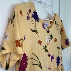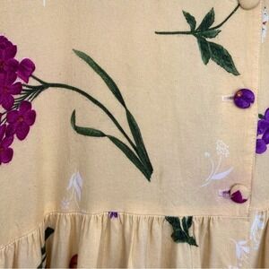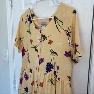 Charming Vintage 90's yellow maxi dress with vibrant floral patterns. Features short sleeves and a flowing design. Shows normal wear. Please see pictures for additional details.