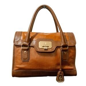 This Cole Haan bag is made of genuine leather and is in excellent condition. It is lined with Cole Haan signature lining that is tan and in excellent condition. On the inside of the bag, there is 1 zip and 2 slip pockets along with a key holder. On the outside, there is 1 large slip pocket that is the length of the bag. This bag also has a bag charm. It has double top handles, gold hardware, and a clasp closure. 10" (H) X 12" (L) X 4" (D) with a 5" handle drop.