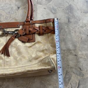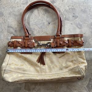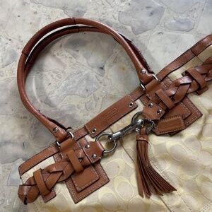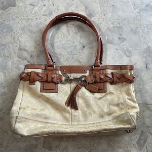 • Features braided handle & leather tassel detail • Measurements in photos • Spacious interior with zip + slip pockets • Classic early 2000s Coach design – perfect everyday or work bag • In good condition please see photos for small stains