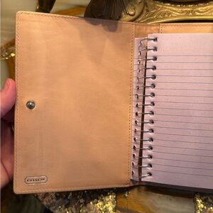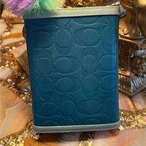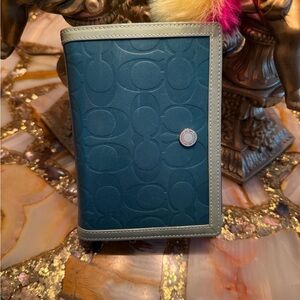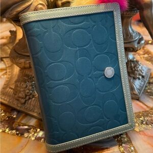 Y2K Coach leather agenda/planner. Featuring beautiful turquoise color leather with signature CC with light green patent leather trim. Inside is a light brown leather. Snap closure.