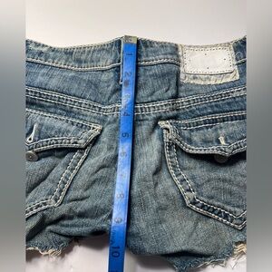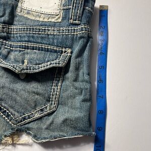 These Elie Tahari jean shorts feature a stylish distressed look with a faded blue wash. The cut-off design offers a casual, laid-back vibe, perfect for warm weather outings. The frayed hem adds a touch of edgy style to these versatile shorts.
