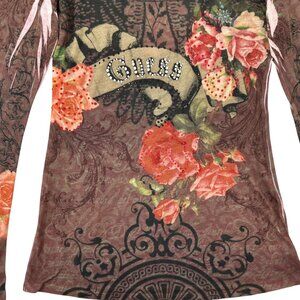 Y2K Vintage GUESS Red Purple Floral Rhinestone Long Sleeve Top sz XS