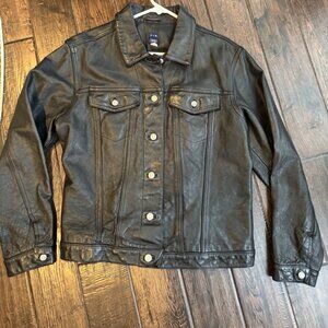 This rare Gap leather jacket is pre-owned but it looks barely worn. There are no scuffs, stains or tears.