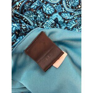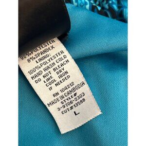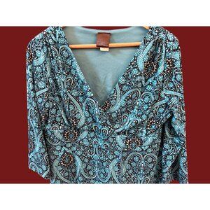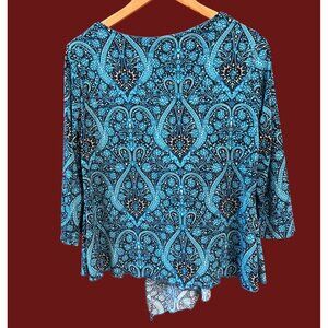 This tunic top showcases a vibrant pattern in shades of blue and black, offering a stylish yet versatile look. The V-neckline complements the empire waist, providing a flattering silhouette suitable for various settings, from casual outings to more formal events. The fabric blend ensures comfort throughout the day.