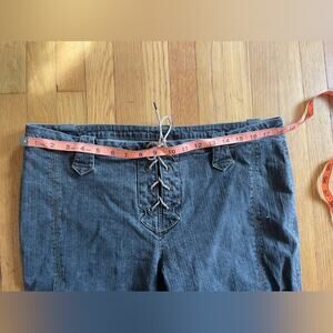 This is an iconic pair of Y2K vintage low rise jeans. Made by Arizona, they are a stretch denim in a grey black wash with minor brown undertones. They lace up the front - very Britney Spears vibes! They are slightly flared. Overall in good vintage condition with no major flaws to note. Marked a size 15 but note measurements in photos for best fit - specifically rise. Approximately a medium to large.