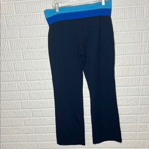 Stylish yoga pants with a blue waistband and navy legs. Perfect for workouts or casual wear.