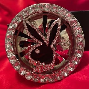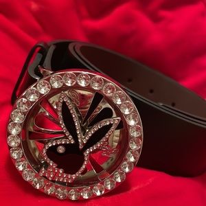 Large glistening stones surround the black enamel Playboy Bunny. The bunny has even more additional bling with an outline of smaller sparkling stones. A twinkling clear stone eye. Bunny spins/rotates freely on buckle. Playboy signature is engraved on the sturdy high gloss chrome buckle. Buckle is attached to a new black belt with snaps which gives you the opportunity to change out the buckle with another favorite. With this being a vintage piece the worn belt has been replaced with a new one.