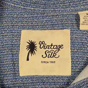 Y2K-inspired short sleeve button-up by Vintage Silk. Features a textured blue pattern, chest pocket, and luxe silk/rayon blend. Great for coastal vacation, retro street style, or summer festival outfits. Pre-owned in excellent condition with no flaws.