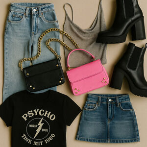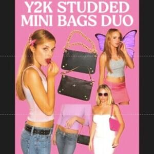 Y2K pink mini purse, black leather shoulder bag, vintage studded bag bundle, chain strap crossbody bag, 2000s party purse, Coachella outfit accessories, Ed Hardy style purse, Paris Hilton aesthetic, Juicy Couture glam bag, festival shoulder bags, club kid Y2K fashion, retro mini bag duo, early 2000s handbags, going out purse, vintage glam accessories, mall goth purse, McBling aesthetic, Destiny’s Child style bag, Bratz doll fashion, micro shoulder bags, Delia's catalog outfit, low rise jeans outfit bag, Y2K capsule wardrobe accessory, nostalgic leather handbag, retro chain strap shoulder bag set