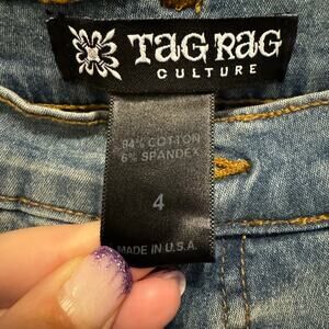 An excellent piece of Y2K! Vintage Tag Rag Culture jeans with crochet inserts on flare legs. Distressed wash. Low rise flares. No back pockets.