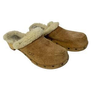 UGG Kalie Clogs Chestnut Suede Sheepskin Lined Studded Block Wood Heel Size 8