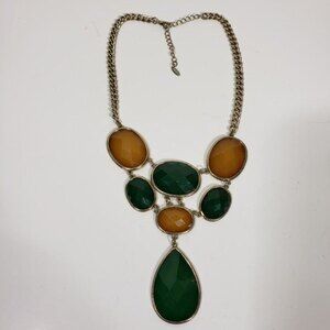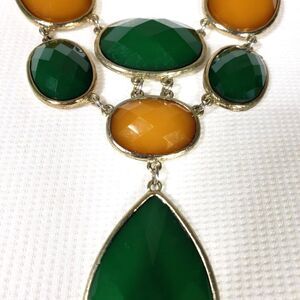 Vintage VCLM Brand statement bib necklace featuring large faceted resin stones in deep emerald green and amber gold tones. Just right for Fall.
